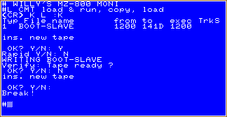 above: If the load process has completed you'll be prompted to exchange the cassette ( "ins. new tape" ) with a new one for the copy. Type in "Y" at the prompt "OK? Y/N: " if the new tape is ready. Choose "Y" at the prompt "Rapid Y/N: " if you want to use double speed ( > 1200 baud ) otherwise choose "N" for normal speed. Now the file will be copied to the new tape and the message "WRITING..." appears. When the copy process has completed you can let verify the file ( "Verify: Tape ready?" ). In this case you have to rewind the tape to the start position of this file and next type in "Y" at the prompt "OK? Y/N: " otherwise "N". Use the Break Key to stop the process, but otherwise you can copy again by typing in "Y" at the prompt "OK? Y/N" and the procedure described above restarts. A full description of all monitor subroutines and the data areas used