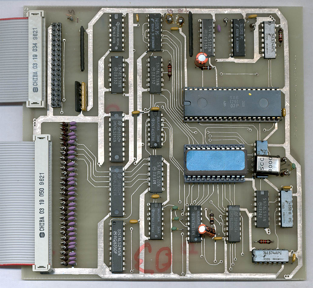 | The disk interface is fitted into a slot concealed by the largest metal cover at the rear of the MZ-800 computer above the volume control. The cover is released by removing two cross-headed screws, and then the disk interface simply slides into the slot, as indicated in Section 7.2.2 of the MZ-800 Owners Manual. As the interface projects out of the rear of the computer, it is a good idea to fit the optional cover ( MZ-1X17 ). MZ-700 owner put the interface into an expansion unit e.g. MZ-1U06 which is to connect to the MZ-700's I/O bus connector. The interface is connected by a cable to the drive(s). The drives are of vertical design and stand alongside ( not on ! ) the computer. When the computer is switched on, any disk in the drive will load automatically. In the previous section we made reference to CP/M, which is one of